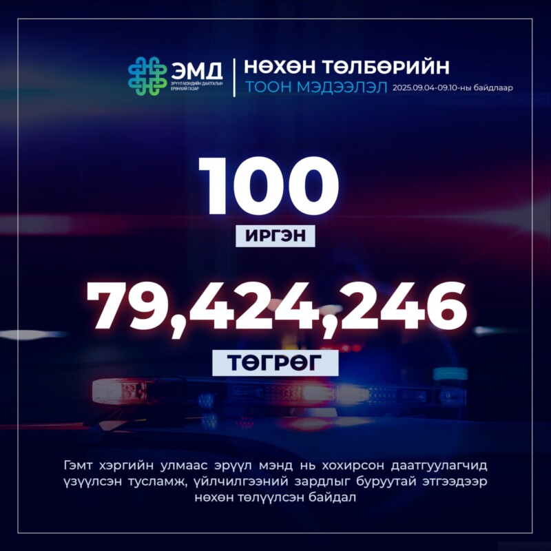 ✅ Тэгвэл 2025 оны 09 дүгээр сарын 04-нөөс 09 дүгээр сарын 10-ны өдрүүдэд гэмт хэргийн улмаас хохирсон 100 даатгуулагч-иргэнд ЭМД-ын сангаас 79 сая 424 мянга 246 төгрөг зарцуулсныг хуулийн хүрээнд буруутай этгээдээр нөхөн төлүүлж, ЭМД-ын санг хохиролгүй болголоо.